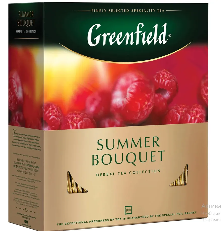 Не содержит кофеина. В состав чая Greenfield Summer Bouquet входят шиповник, гибискус, кусочки малины и сушеное яблоко. Он наполнен витаминами, восстанавливает силы и энергию в организме. При заварке получается насыщенный алый настой, который отлично утоляет жажду. Напиток можно употреблять охлажденным. Яркий аромат спелой малины доминирует в композиции. Травяной чай - жизнерадостное и экзотическое сочетание вкусов. В любое время года он будет напоминать вам о лете благодаря особому вкусу.